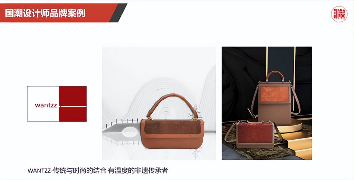 第三个案例是我们合作的品牌WANTZZ,这个品牌运用了将香云纱与牛皮组合的制包工艺,香云纱本身也是一种非遗传承技术。欢迎大家到我们的线下展厅来体验,感受这些美的产品。因为好的工艺,好的面料你在网上看照片是看不出来的,产品自身的质感与品质要亲自摸过才知道。