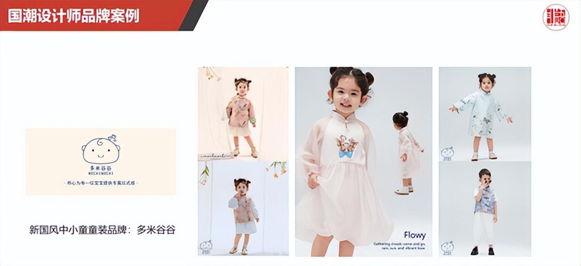 这个品牌有两位创始人,一位是从纽约帕森斯毕业回来的,另外一位创始人是一位宝妈。两位创始人做这个牌子的原由是这位宝妈想给自己的宝宝做周岁礼服,在网上找了很久却发现没有一件合适的,花了几千块钱买回来的定制款穿在宝宝身上也不合适。所以她也很生气,觉得“童装就这么难做吗?我自己来做”。 所以多米谷谷是一个因为自己的需求而诞生的品牌,品牌所有的产品研发也都是以客户需求为出发点来做的。多米谷谷品牌服装的所有内衬全部都是真丝的,而且因为宝宝的头颈肩比例和我们成人的头颈肩比例不一样,脖子部位都做了一定的放大处理。
