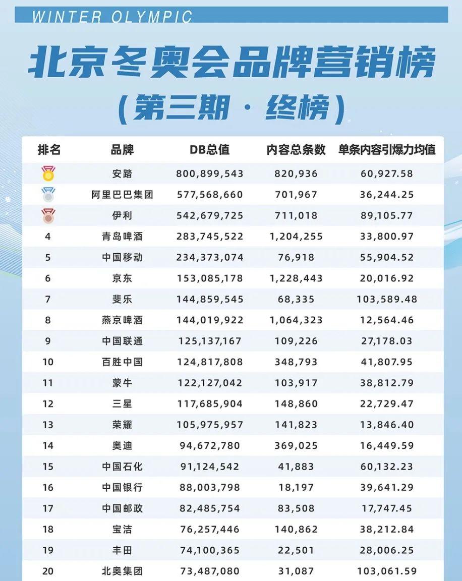 在新发布的《北京冬奥会品牌营销榜(终榜)》上,跻身前五的品牌中,非奥运官赞的品牌只有一个,就是中国移动。而作为冬奥官方合作伙伴的中国联通,仅位列第9。