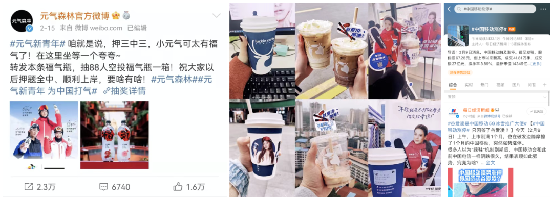 反而提前押中题的非官赞品牌们,总能借代言人起势爆火:除了蒙牛之外,还有苏翊鸣夺冠后,“押三中三,赢麻了”的元气森林,以及谷爱凌夺冠后,在A股市场冲至涨停的中国移动、被网友推上热搜躺赢的瑞幸。