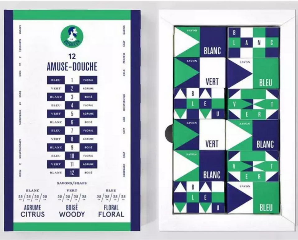 【迷你三重奏】 Pack 3 Amuse-Douche Mini-Soap包含花香savon bleu(蓝色肥皂)、木质香味savon blanc(白色肥皂)、柑橘味savon vert(绿色肥皂 )一份三块迷你香皂。