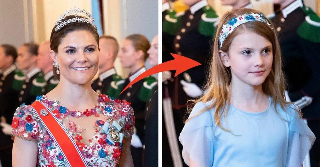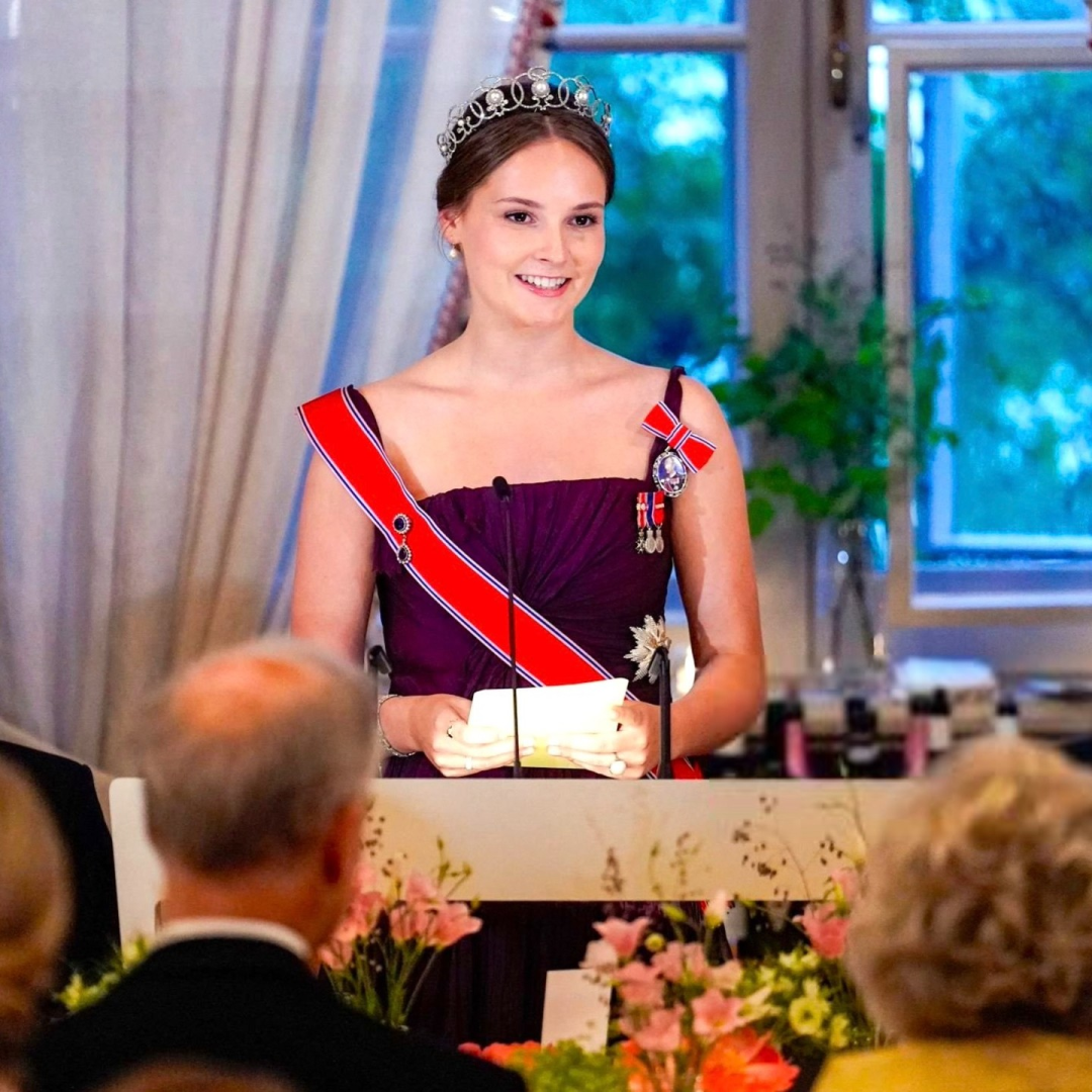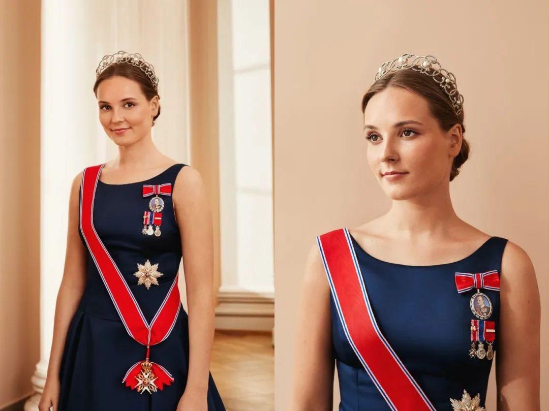 这次造型也不例外,活动前放出的官方照中,她穿的这件衣服就是母亲王储妃梅特2001年穿过的旧礼服,佩了绶带,胸前还戴了圣奥拉夫勋章和挪威国王哈拉尔五世王室勋章。从小就颜值不错的她,如今出脱得气质更好了,隐隐看到了未来女王的风范。