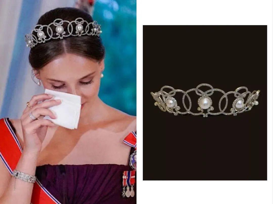 定妆照中公主的冠冕也格外抢眼,第二天宴会她也戴了。这顶钻石珍珠冠冕来自宝诗龙,是已故的拉格茜尔公主(挪威国王哈拉尔五世的姐姐)后人传给她的,拥有120年历史。她还搭配了拉格茜尔公主的手镯,以及珍珠耳环、珍珠戒指和一枚紫水晶胸针。