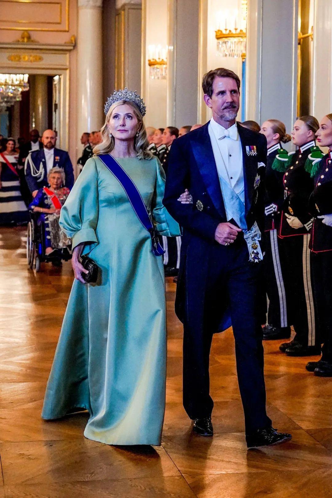 虽然早已被废黜但一直在王室圈里很活跃的希腊王室也来了,他家和挪威王室一样,都是丹麦王室的分家。王储妃玛丽-尚塔尔这顶冠冕看着特别有气势,造型繁复古典,是原来希腊王后索菲亚的物品,1960年代希腊王室被流放后就没再出现过,被认为是卖掉了,直到2012年才重现公众视野。