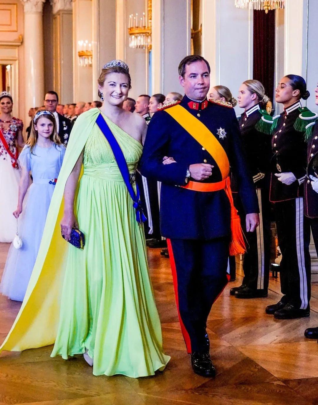各种知名大王室以外,也有不少小王室来参加趴体。比如卢森堡大公储纪尧姆和卢森堡大公储妃史蒂芬妮,史蒂芬妮佩戴的阿德莱德冠冕,是1865年至1870年间为阿德莱德大公夫人打造的,中间点缀了一颗大蓝宝。
