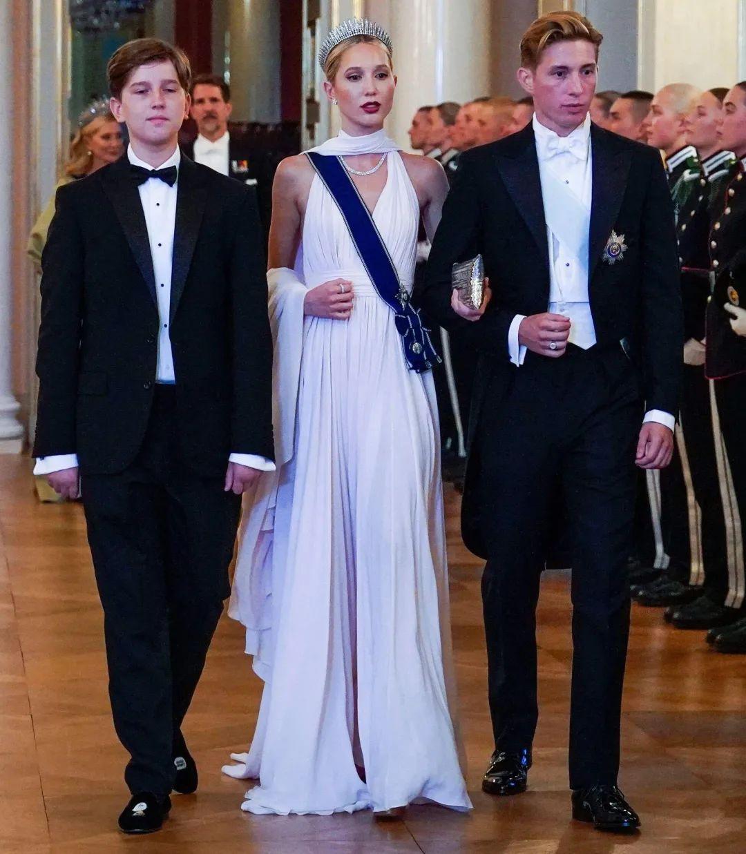 希腊的康斯坦丁·阿莱克修斯王子、玛丽亚-奥林匹亚公主和阿里斯蒂迪斯-斯塔夫罗斯王子也跟着来了。奥林匹亚公主一袭白裙打扮得像是在cos希腊女神,这顶米勒流苏冠冕是她妈妈玛丽-尚塔尔娘家的珠宝,相当壕气。