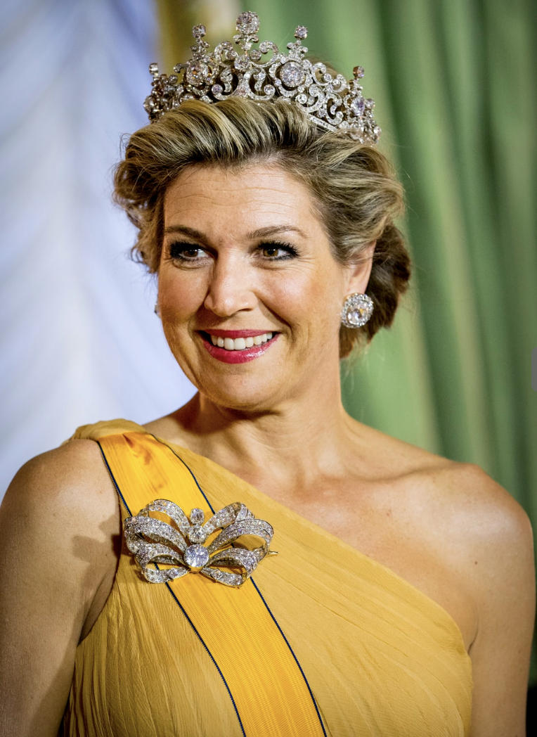 佩戴的斯图尔特冠冕也来头不小,是1897年为荷兰威廉明娜女王授职仪式制作,饰有大颗斯图尔特钻石,也曾属于英格兰国王威廉三世和玛丽二世女王,特别璀璨华丽。