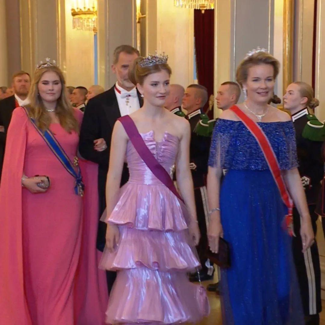 入场时乖巧地跟着妈妈比利时王后马蒂尔德一起,母女二人的礼服均来自Armani私人定制。