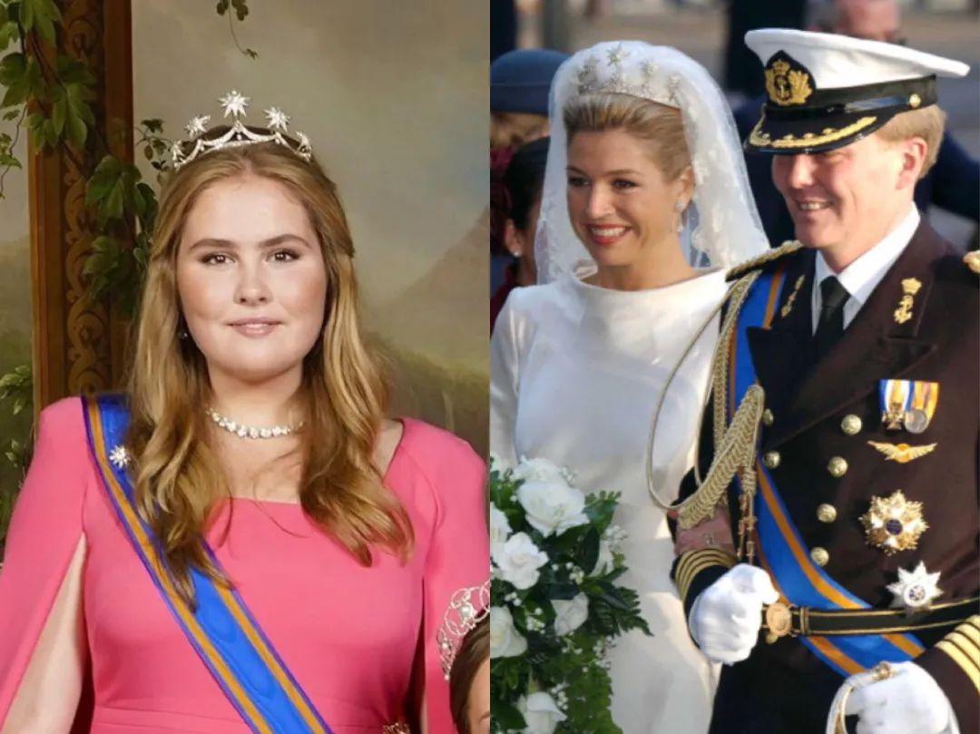 荷兰王储阿玛丽亚佩戴的这顶荷兰钻石之星冠冕,造型有点卡通,是她的妈妈马克西玛王后结婚时佩戴的冠冕,也是荷兰王室传家宝一般的存在,粉色斗篷礼服则来自她妈妈爱品牌Natan的高定。