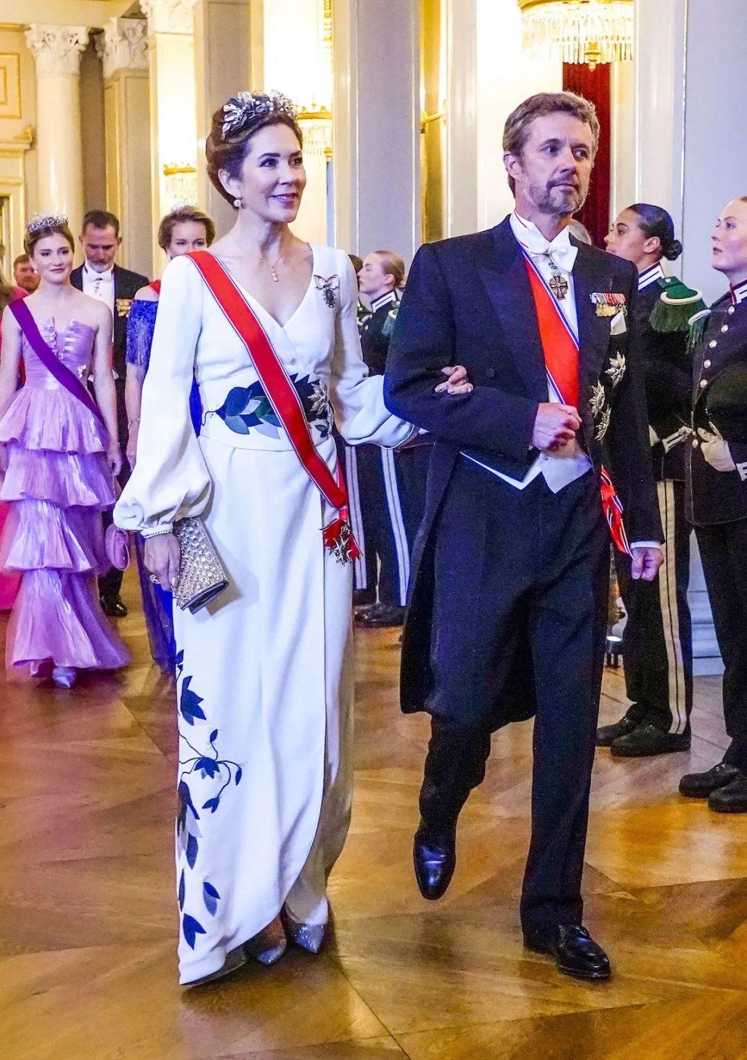 丹麦王室是挪威王室的本家,都属于格吕克斯堡王朝。现在挪威王室的“太祖”哈康七世,是丹麦国王弗雷德里克八世的二儿子。这次丹麦派出王储弗雷德里克和王储妃玛丽“走亲戚”,玛丽穿了一件落落大方的白色礼服,佩戴了午夜冠冕。