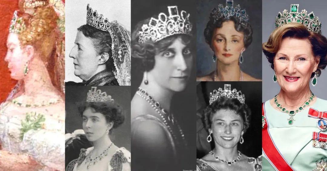 这套祖母绿套装也是挪威王室具标志性的珠宝之一,据悉开始可能是拿破仑送给他的继女奥古斯塔公主的结婚礼物,后来历经多任王后,传到宋雅手中。