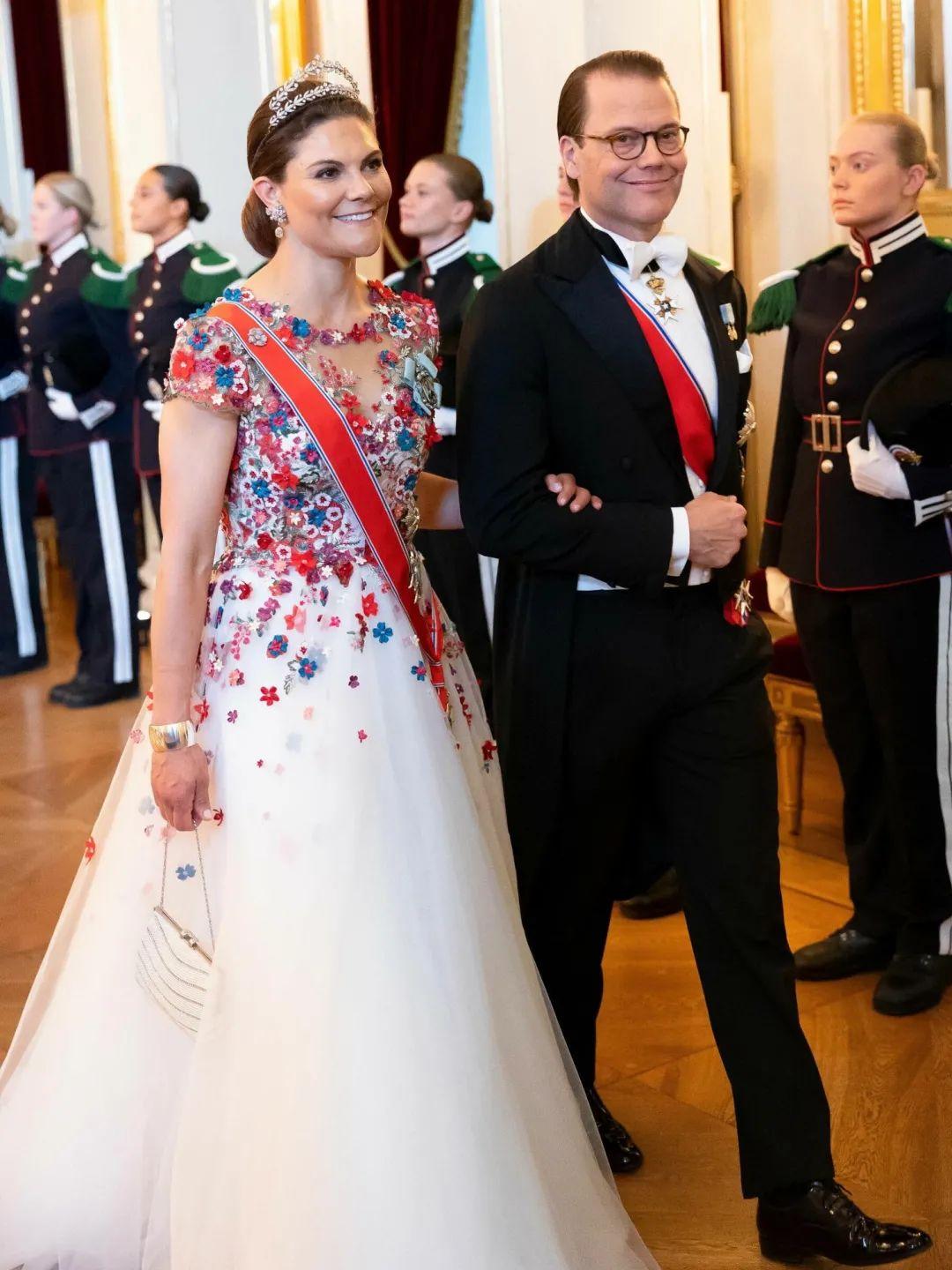 瑞典维多利亚王储挽着老公丹尼尔亲王入场,礼服选择了一条梦幻又有活力的花卉纱裙。佩戴的冠冕名为月桂花环,2013年由瑞典莉莲公主传给她,也有一百多年的历史了。