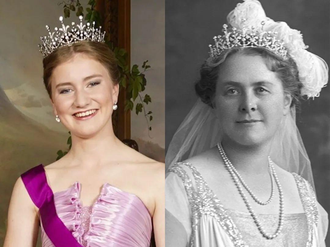 像比利时王储伊丽莎白公主的冠冕,据说是件古董,看起来特别奢华但来历却存疑。这顶是父母送给她的成年礼物,有人发现沙俄皇后亚历珊德拉曾有过类似的一款,不过更像是英国维斯蒂男爵家男爵夫人的这顶。