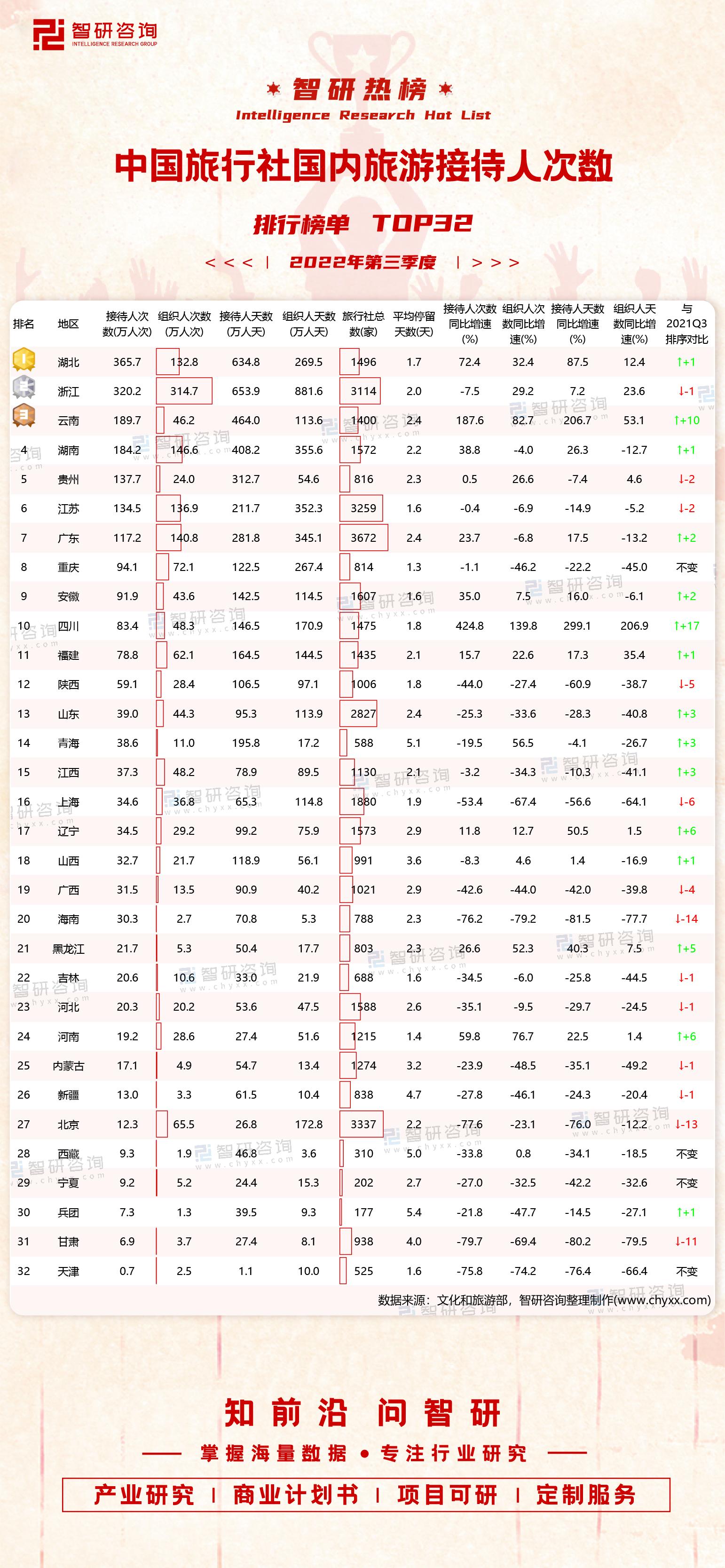 依据榜单可知,7个地区第三季度接待人次数超过百万人次,其中湖北、浙江以超过300万人次夺得冠亚军,仅天津接待人次数不足万人次。相较于2021年第三季度,11个地区接待人次数有所增加,四川、云南同比增速超过,甘肃降幅高。