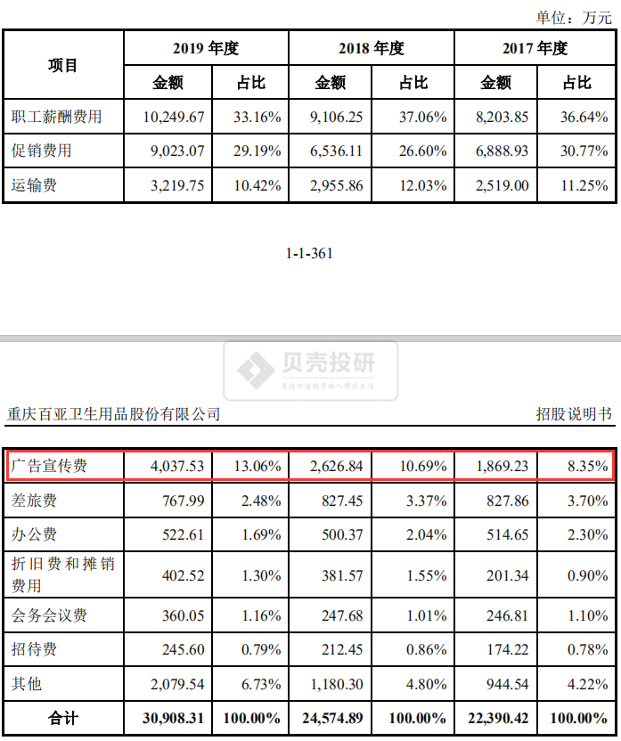 高昂的代言广告费在百亚股份的销售费用上有体现。2017-2019年,百亚股份股票(003006)在广告宣传上的花费从1863万上升到4038万,增长了一倍还多。而这块费用在整个销售费用里的占比也从8.35%上升到13.06%。
