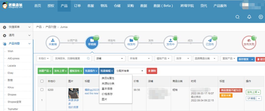 1. 产品刊登,支持批量刊登,批量修改参数。