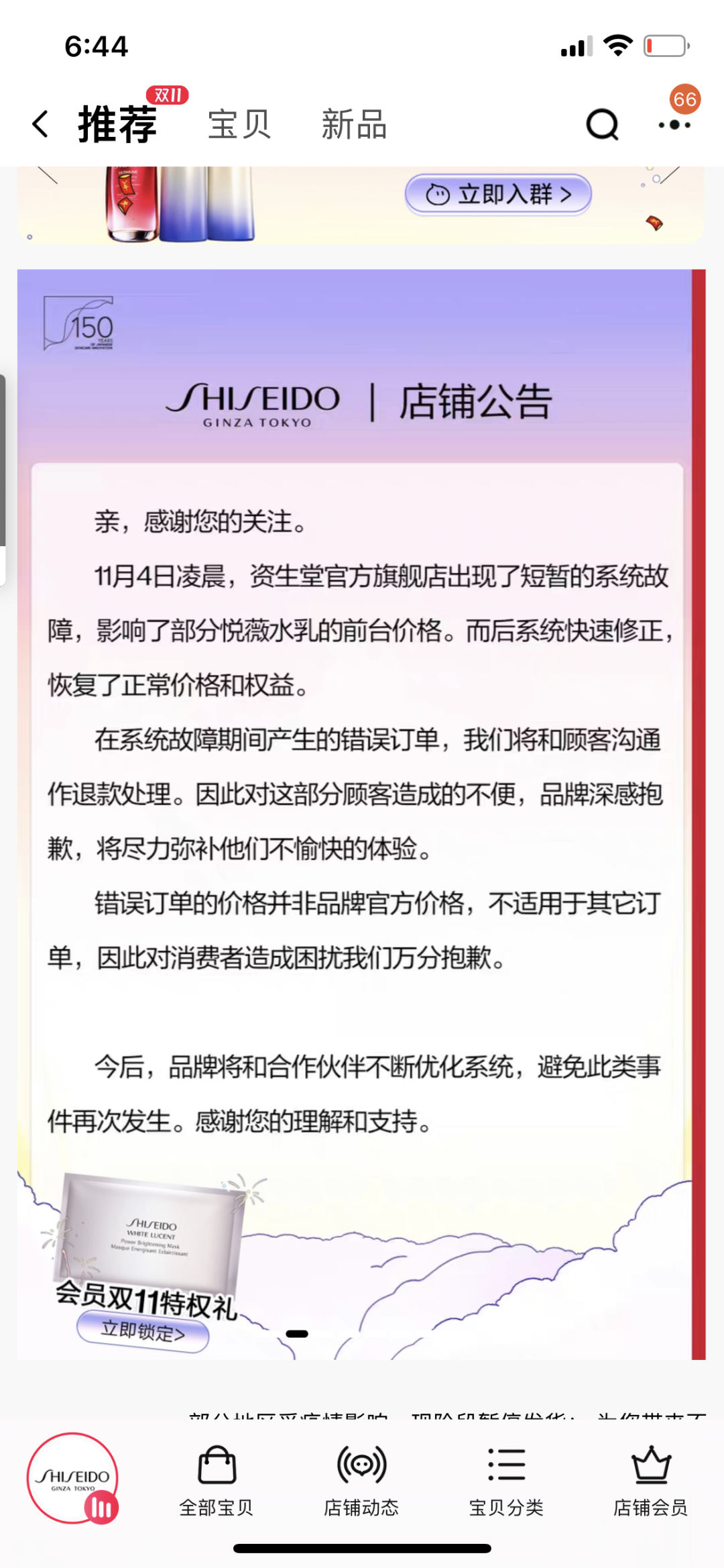 随后11月4日晚,资生堂旗舰店发布公告解释:11月4日0点,因系统问题,店铺出现了短暂的价格异常;目前店铺商品已恢复正常价格;第一时间成立了专项小组调查和处理该问题;针对价格异常的订单,将一一与相关消费者沟通,统一做退款处理。