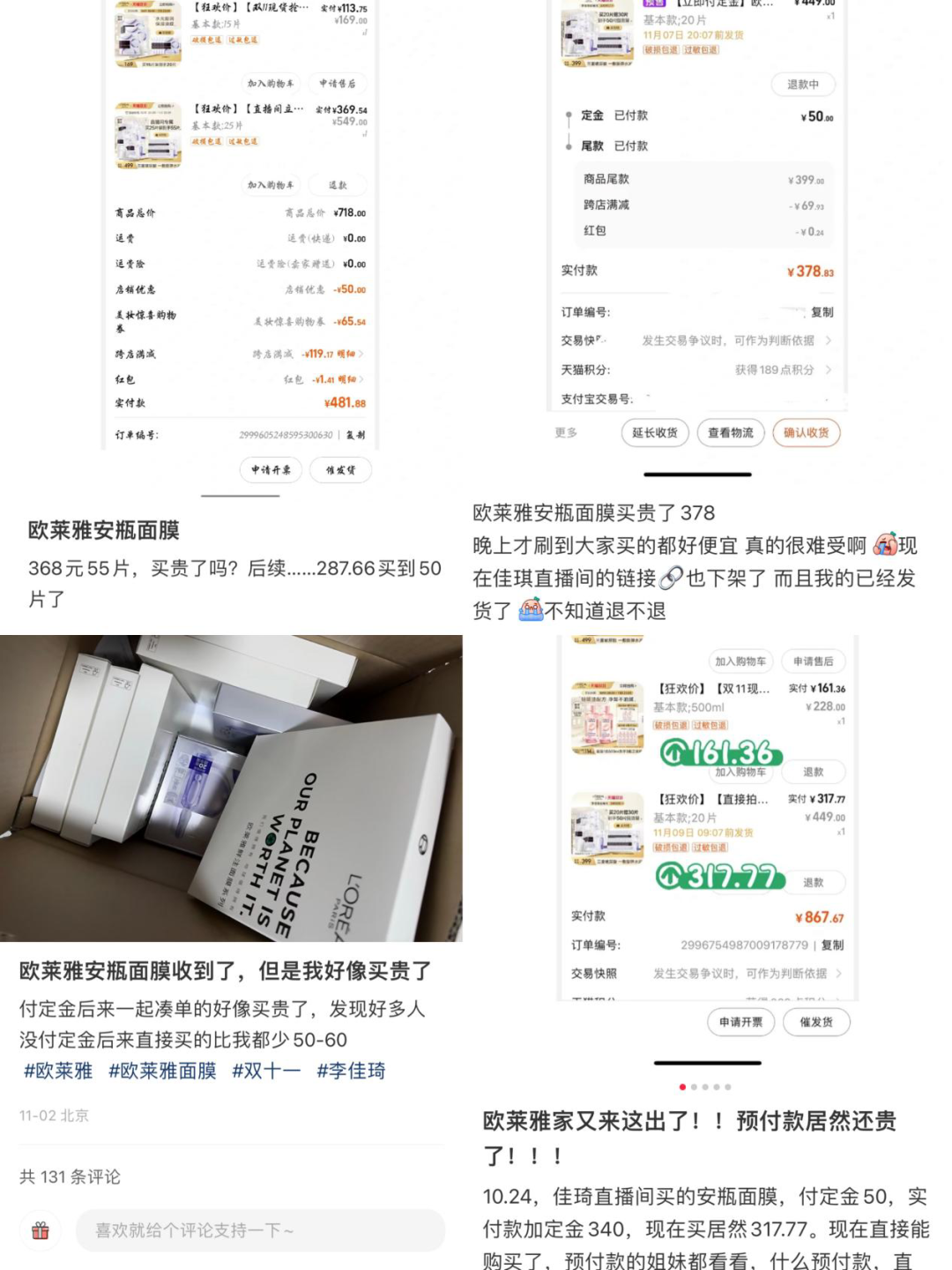 同时也有消费者在社交媒体上吐槽在李佳琦直播间欧莱雅安瓶面膜买贵了,50片安瓶面膜有消费者显示实付429元、368元、328元、287元,还有人只用253元拿下。