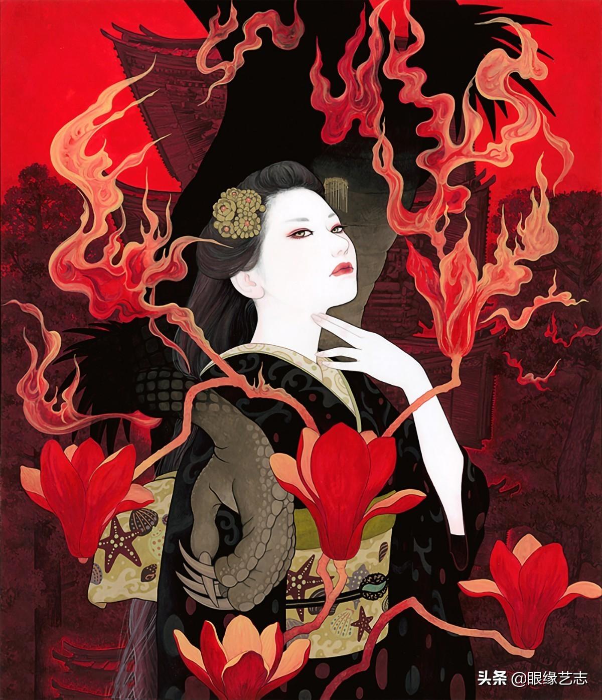 加藤美纪的作品在保留了日本画传统美感的同时,通过角色的塑造与色彩的调制,表现出明快的跳跃感与十足的现代感。其精致的世界观通过画中美人身着的和服展现得一览无余,而画面背景中不同风格的建筑与景物又把复古之韵与现代之美融合得恰到好处。去皮麻纸与水粉的组合,更是将作品的质感推向清丽与温暖的宜人境界。在这样的境界中,和服之美、美人之美、景物之美融于一纸,美不胜收。