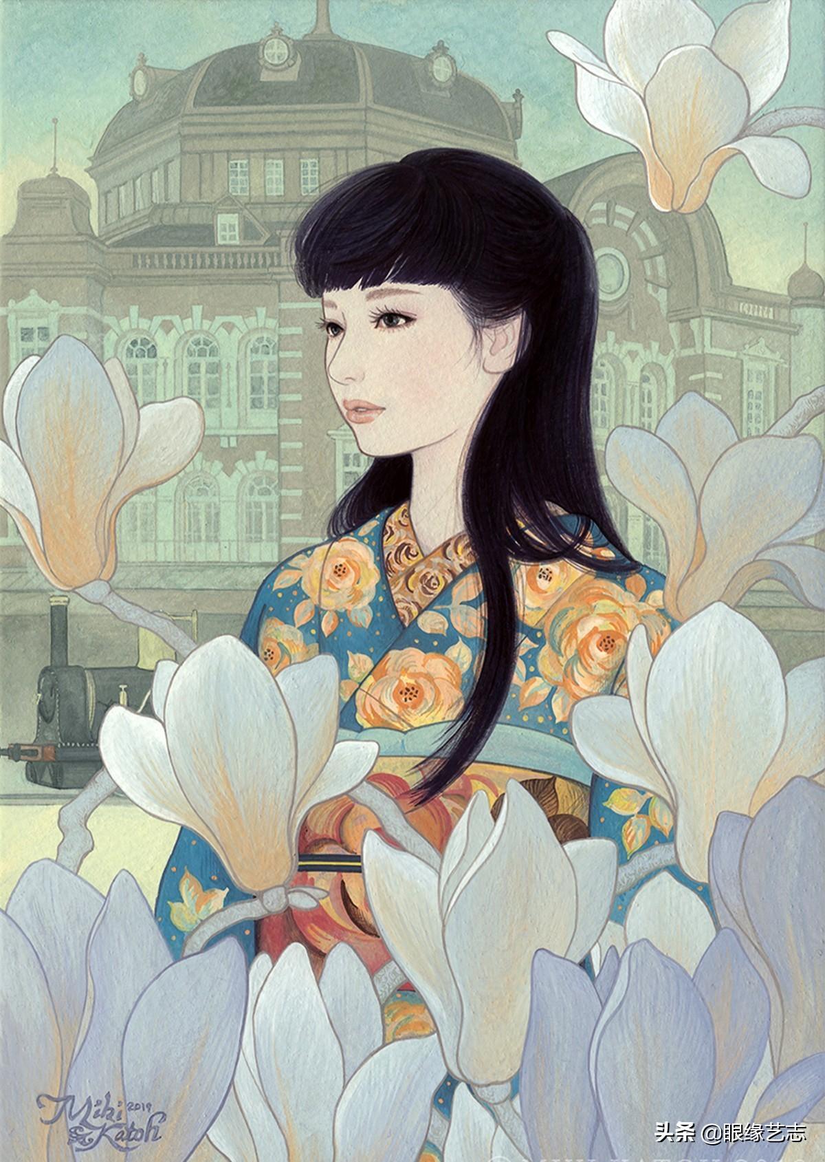 加藤美纪的和服丽人我们现在所看到的作品来自日本当代画家加藤美纪女士。加藤美纪出生在日本关东地区的埼玉县,1996年毕业于日本女子美术大学西方绘画系。毕业后,她在一家文具制造商担任设计师,1999年正式成为一位自由插画师,之后多次在日本国内及台湾地区举办个展及参加群展。