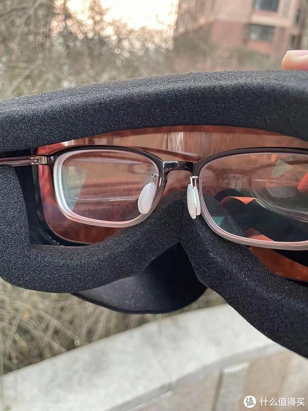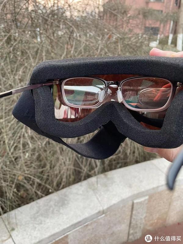 此雪镜为通用型,所以近视眼也可以使用,下图两侧的内凹就是卡眼镜的。