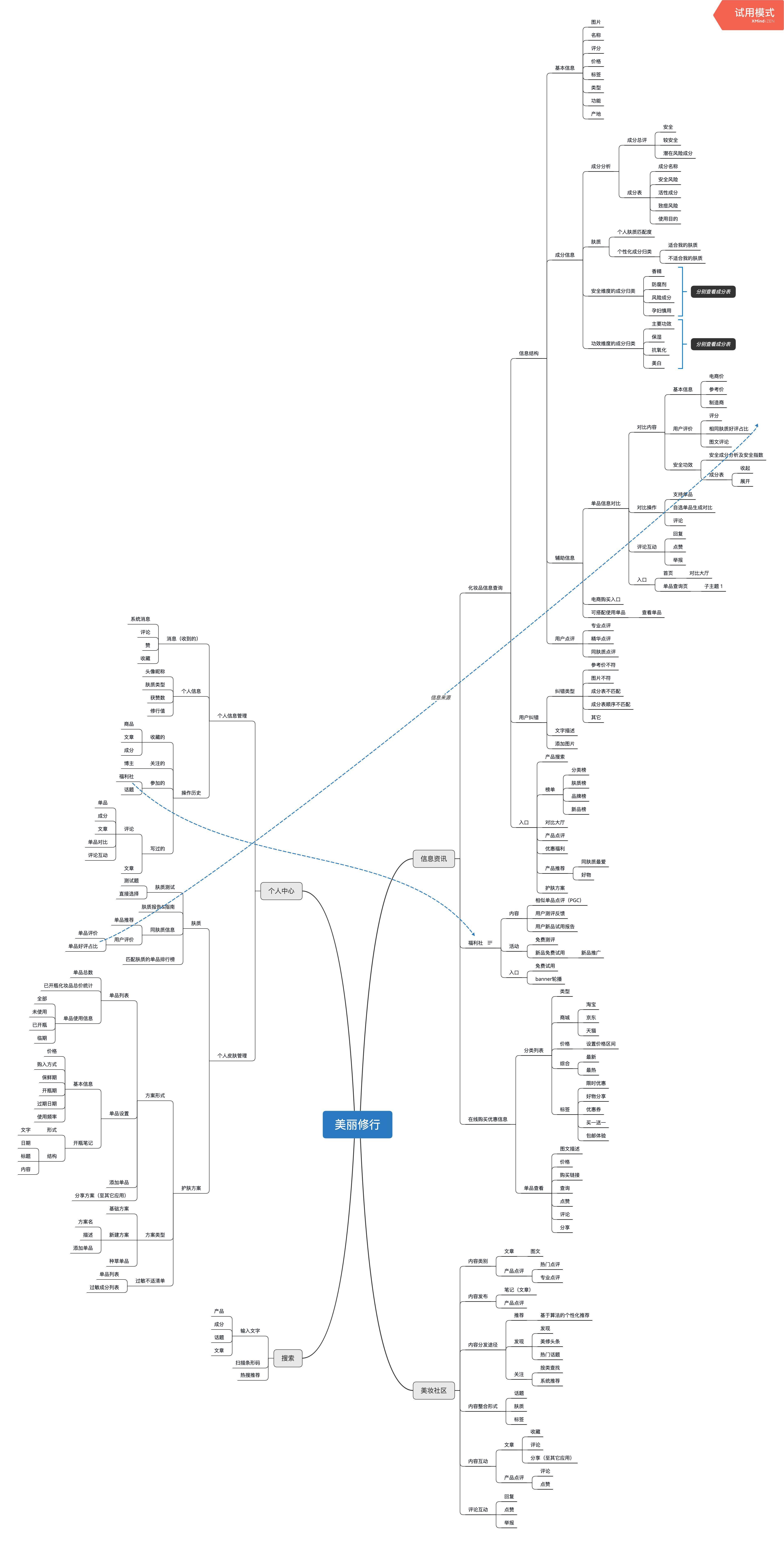 3. 产品拆解与用户角色地图美丽修行在分析过程中被拆分为了信息资讯、美妆社区、搜索和个人中心四个业务板块,其中信息咨询是美丽修行核心业务,而搜索和美妆社区则是为了完善信息咨询服务的辅助模块。每个业务的核心服务和实现服务的具体功能模块在图中均被详细列出, 以便读者更好地了解产品。具体拆分结构可见图1。