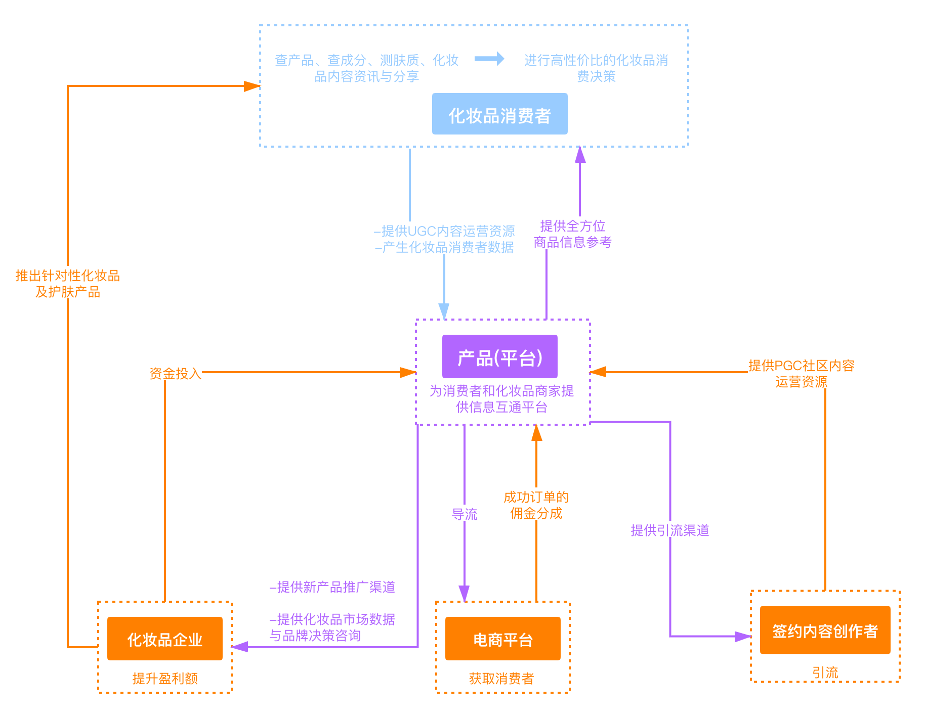 用户角色地图则概括了美丽修行的整体运营模式,通过产品平台、化妆品消费者(同时也是美丽修行的c端用户、内容创作者和化妆品企业四类角色间的利益供需关系,解读美丽修行解决的主要需求点和可探索的商业模式。