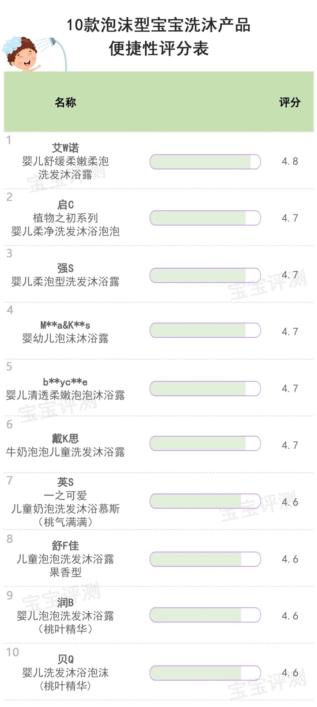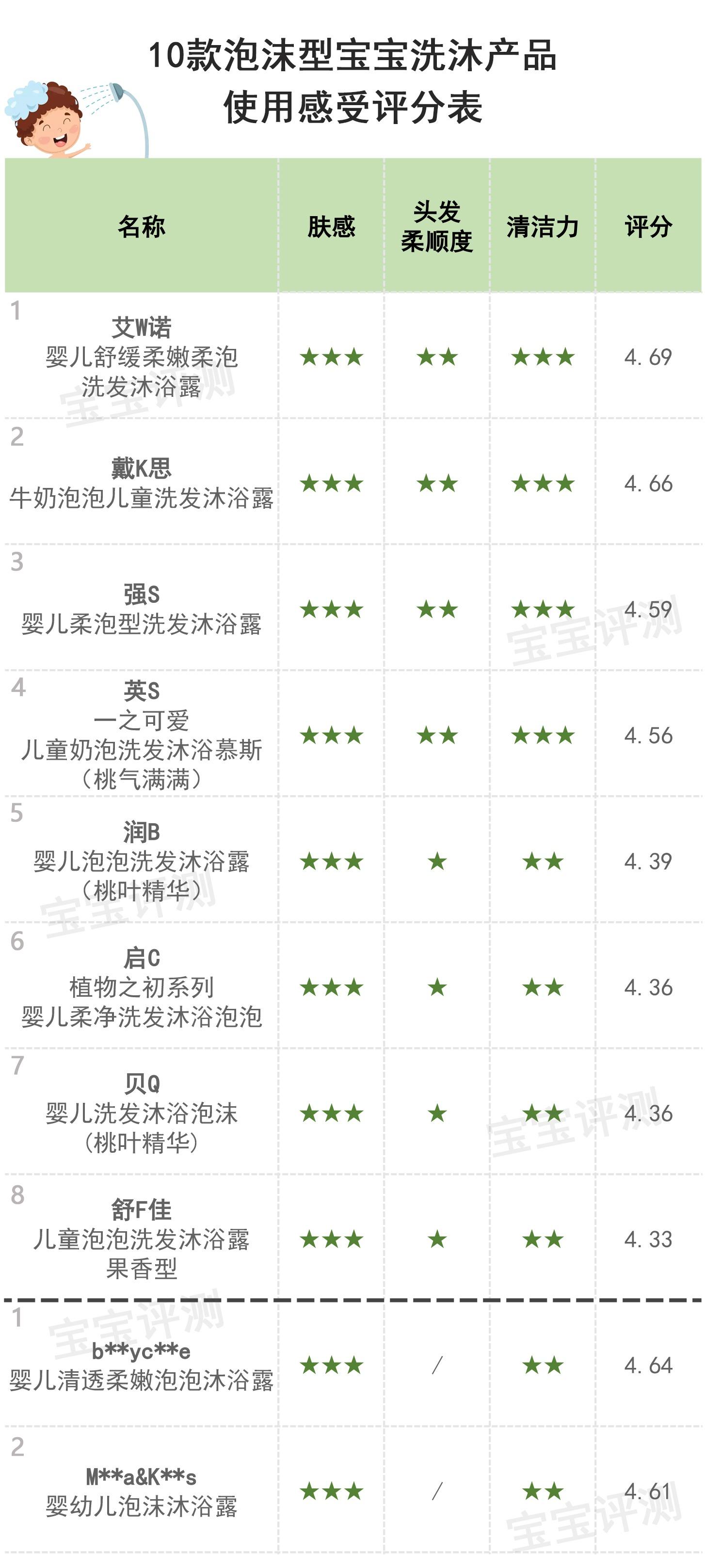 总评及综合推荐综合以上几项评测结果,为给大家提供一个相对比较直观的参考,笨爸爸对10款泡沫型宝宝洗沐产品进行了评分及排名: