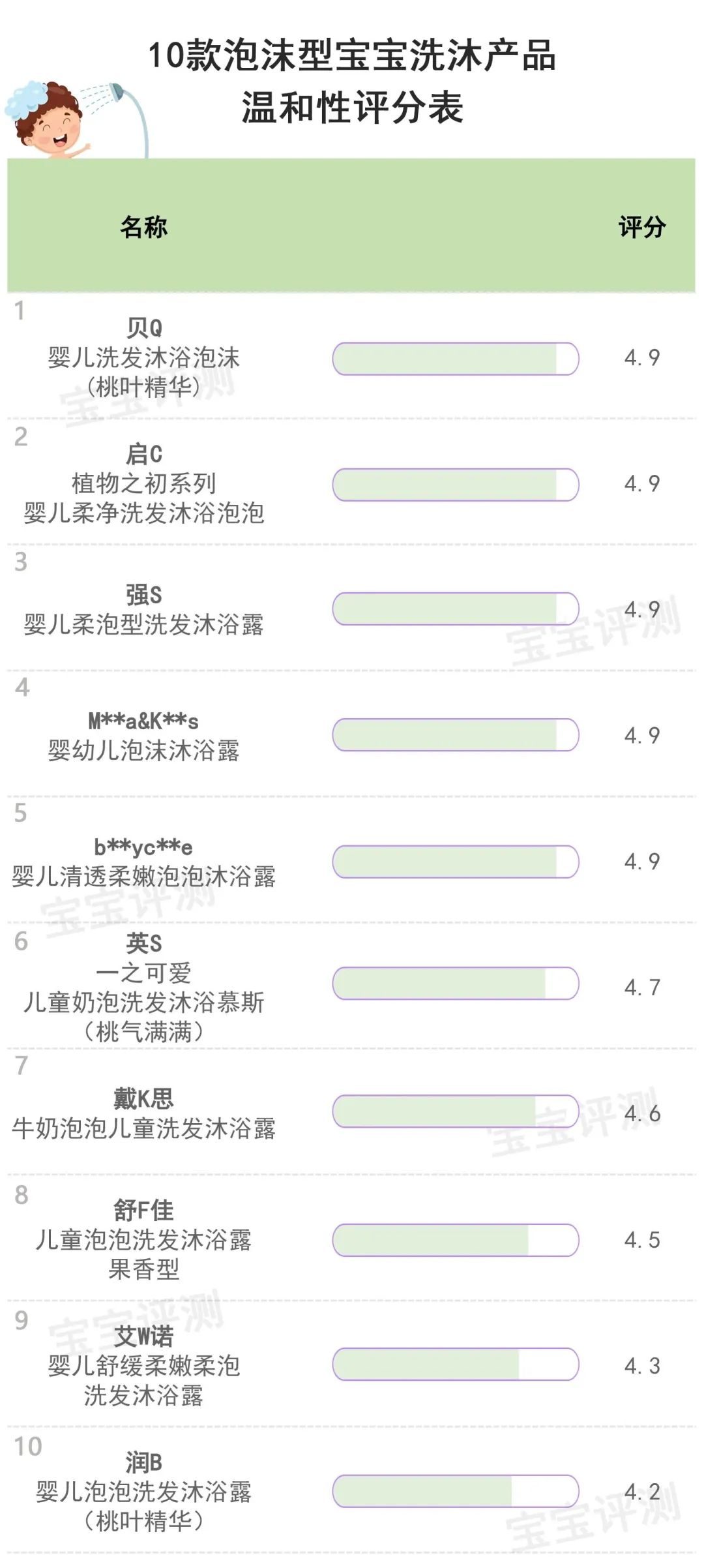 综合以上分析,10款泡沫型宝宝洗沐产品笨爸爸给出的温和性评分情况如下: