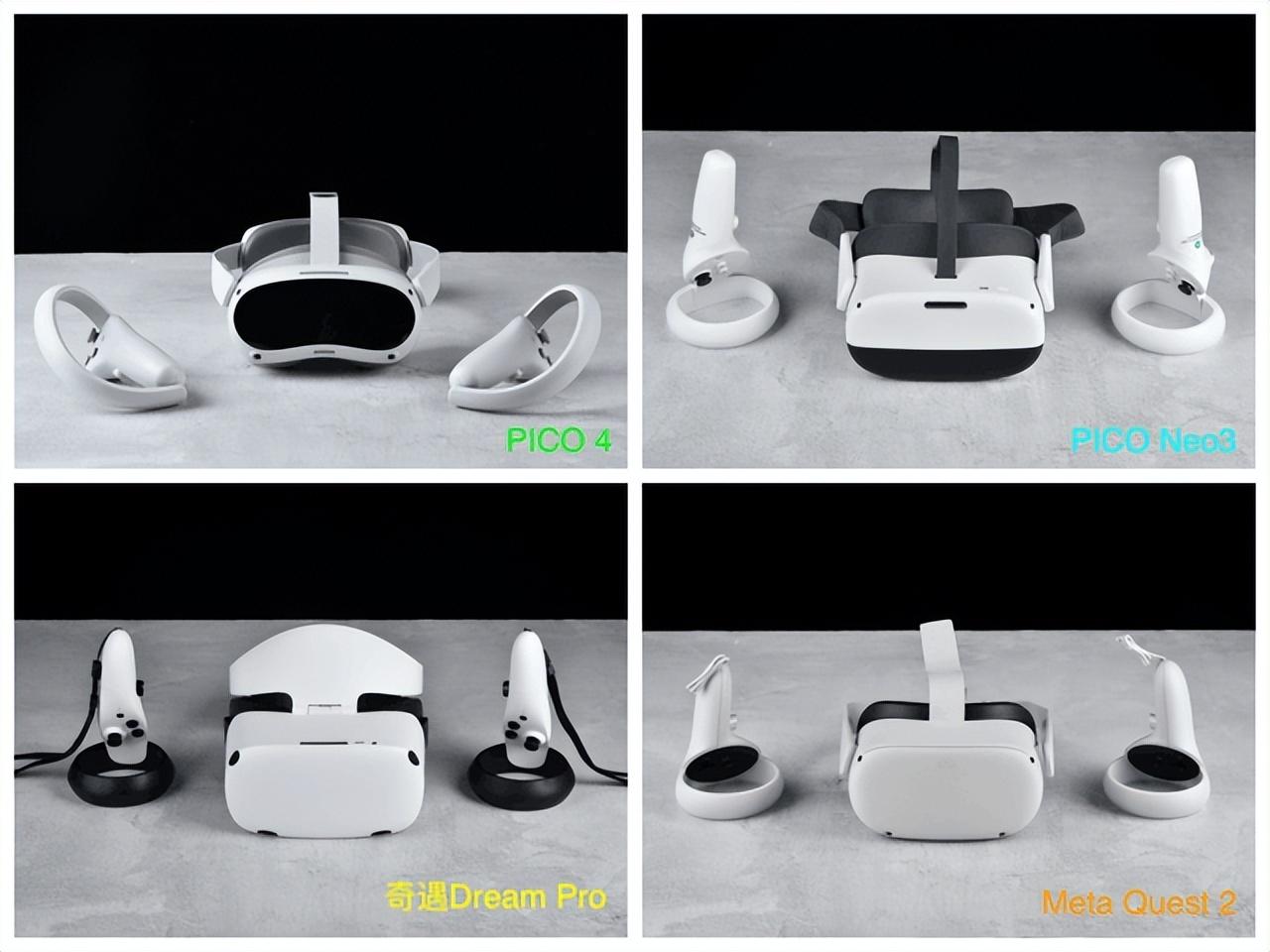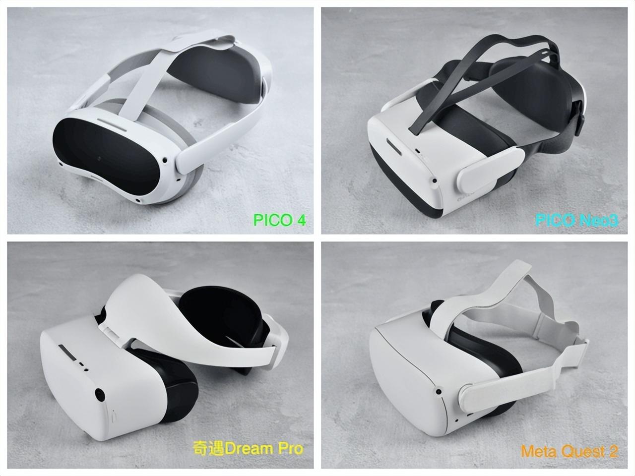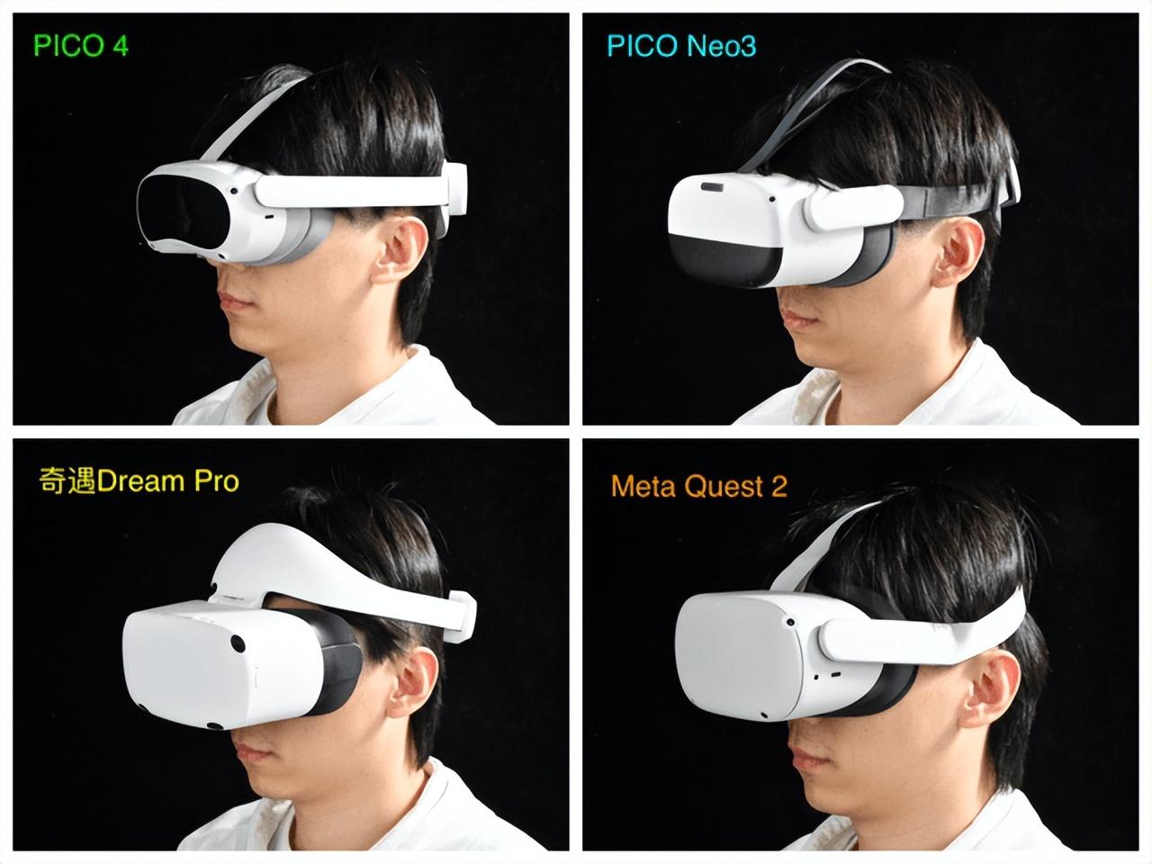 首先对于一款长时间佩戴的科技产品而言,佩戴舒适度一定是重中之重。从上图中我们可以看到,四款产品在重量及前后重量的分布存在差异。通过我对它们进行的重量实测,Quest 2整机重量(524g)是四款产品中轻的,接下来依次是PICO 4(581g)、PICO Neo3(625g)、奇遇Dream Pro(692g)。
