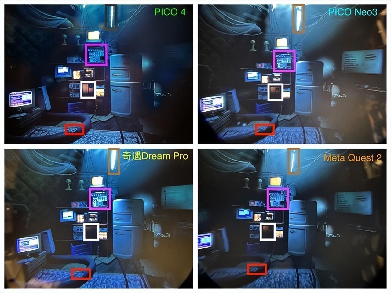 而在场景实拍的图片画面中,当我们仔细观察红框内的电线与白框内的木盒可以看出,PICO 4不仅对于光影的处理会更加细腻,对物品的细节相较于另外三款也会更清晰;而当我们聚焦于紫框内的元器件和棕框内对灯管可以很看出,PICO Neo3和奇遇Dream Pro对于这两个细节会产生光线过爆的情况,而Quest 2相较于PICO 4在亮部细节的优化上会更胜一筹。综合来看,PICO 4相较于另外三款产品而言,在整体细节处理上会更好,并且“甜蜜点”的清晰度区域也更大一些。