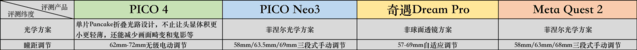 在关键硬件参数图中,我们可以发现PICO Neo3、Quest 2是三段式固定档位的瞳距调节,需要我们通过手动来调节两个镜片的距离,实现相对合适的瞳距;奇遇Dream Pro的瞳距调节方式采用自适应调节,需要眼睛去适应固定的瞳距范围。经过实际体验,以上三款VR设备的瞳距调节方式,会带给我一定的视觉不适感,同时使用便捷度也有待提升。