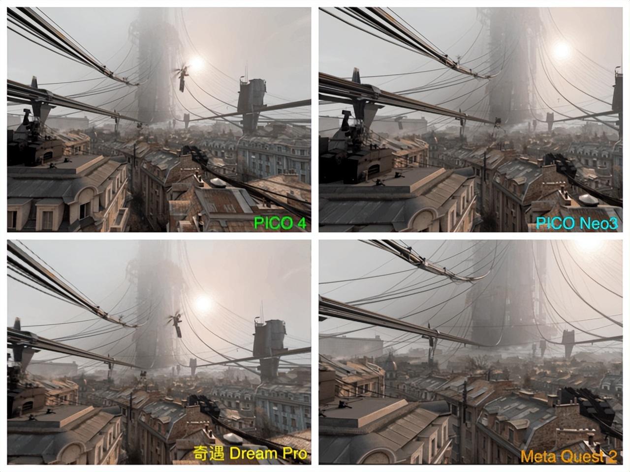 为了更加公平进行屏幕素质的评测,我使用了四款产品在同一场景分别进行了场景渲染与场景实拍的体验。首先从场景渲染的图片画面中,我们可以很看出PICO 4的FOV(视场角)要比另外三款产品都要更大,从而让我们可以获得更宽广的视野范围。