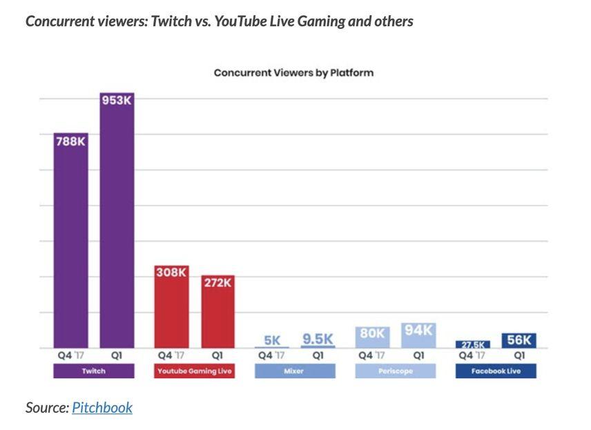 从下图可以很直观地看出,Twitch相比YouTube、Facebook旗下的、以及Mixer等游戏直播平台,同时在线观看人数要高出很多,并且是呈增长趋势;而YouTube Gaming Live的同时在线观看量则是下降趋势。