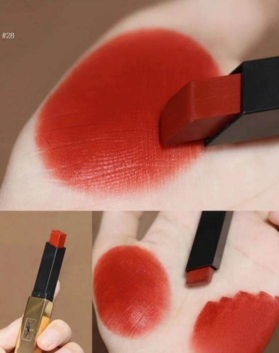 我常用的是28号色,真的巨显白显气色,飒甜的胡萝卜色,哑光+胡萝卜砖红。薄涂是减龄的元起色,厚涂炒鸡洋气,整个人都感觉提亮了几度,一点都不挑肤色,特别是对像我这种比较“发黄”的小麦肤色友好,不会显黑显土的。