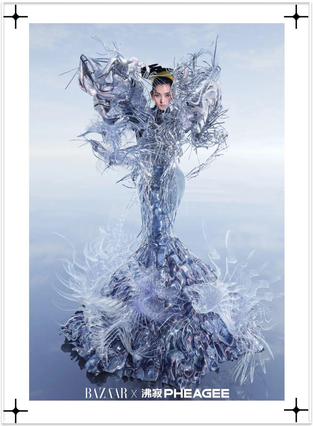 《时尚芭莎》携同沸寂Pheagee一同踏上了一场跨越时空星际之旅,张丽娜身穿AVAR虚拟厂牌设计的“星梦清河”虚拟服装。