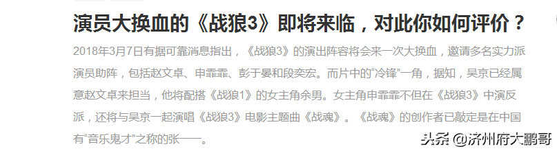 近日网传“电影《战狼3》的演出阵容将会来一次大换血,拟邀请多名实力派演员来助阵,其中包括赵文卓、申霏霏、彭于晏和段奕宏。而片中的“冷锋”一角,据知,吴京已经属意赵文卓来担当!”,鹏哥来分析下,这个传言的真实性有几分!