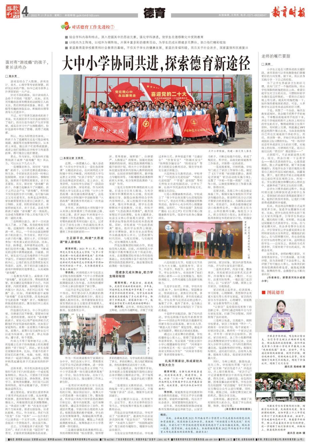 系统、地呈现2021年河南省中小学德育工作先进集体的特色实践和有益探索,促进经验交流和分享,本版的“对话德育工作先进校”系列报道,目前已对7所学校的德育创新实践进行了立体化报道呈现,到此告一段落。德育创新,永远在路上。本版将继续聚焦2022年河南省中小学德育工作先进集体的实践智慧,敬请关注!