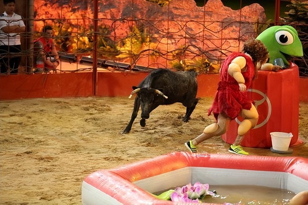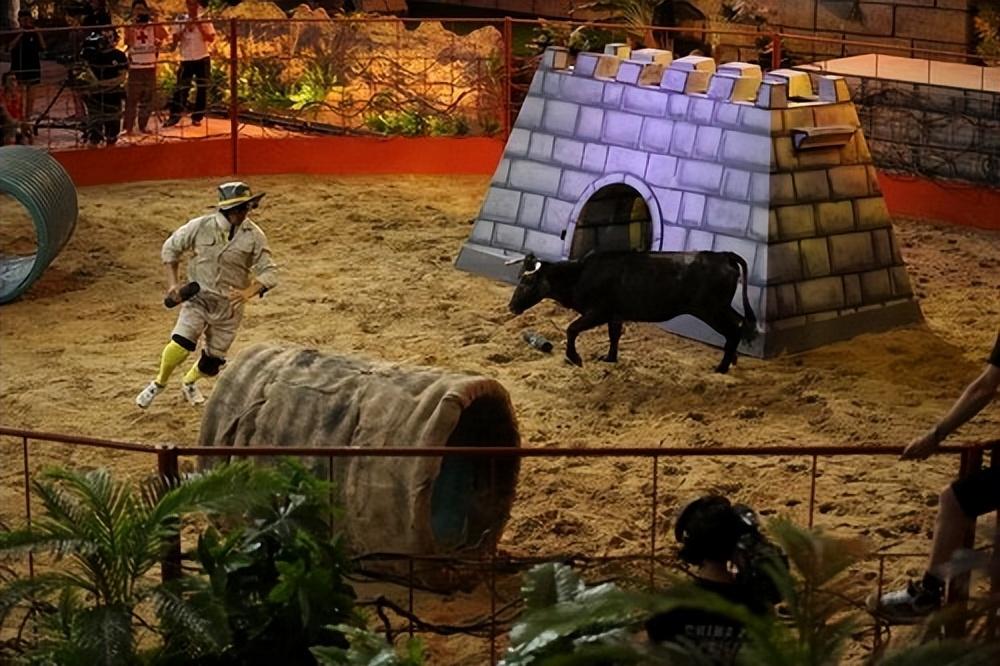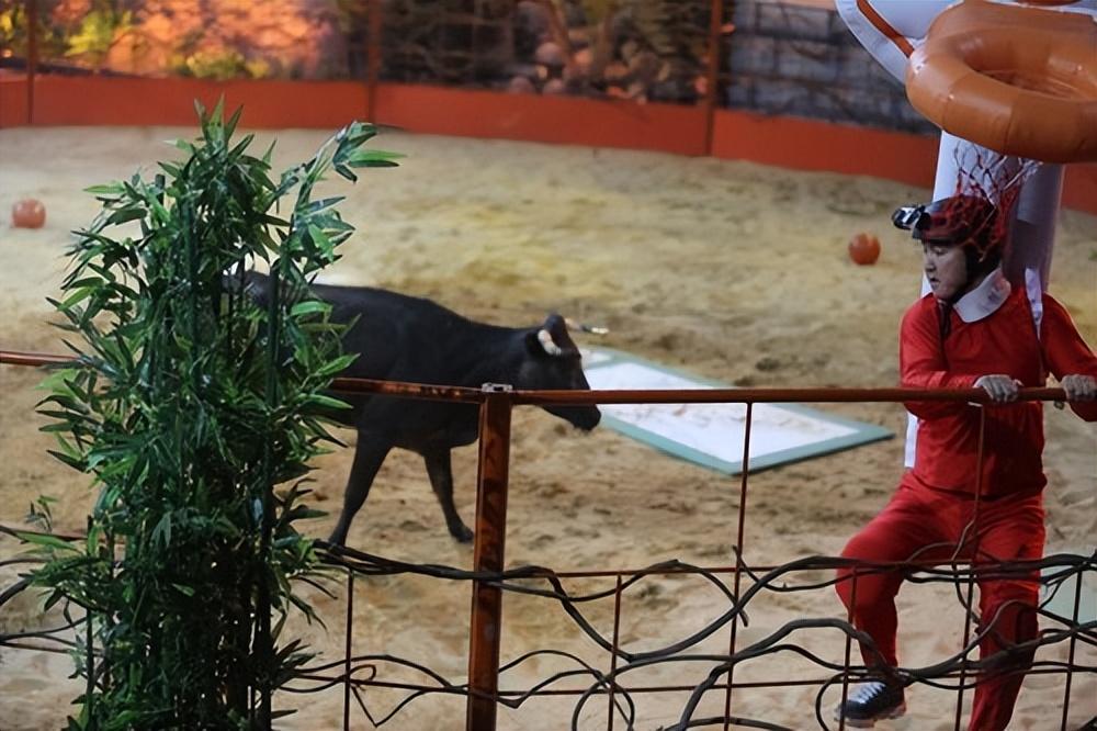 在“斗牛”环节中选手们需要一边躲避斗牛的攻击一边完成游戏任务,但是几乎每每到了这个环节都会有选手被牛顶飞,还有好多选手被牛逼到比赛场地周围的铁栅栏上久久不敢下地。