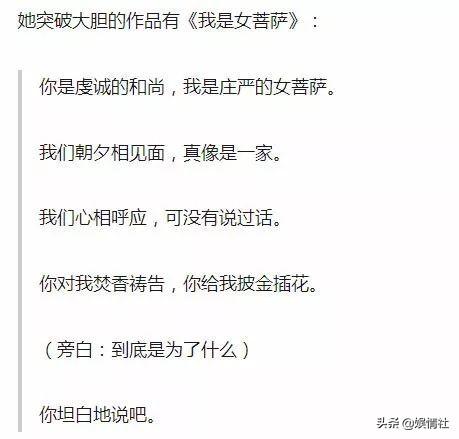 她一只手拈住麦克风,一只手却一径满不在乎地挑弄她那一头蓬得像只大鸟窝似的头发。她翘起下巴颏儿,一字一句,清清楚楚地唱着……她的身子微微倾向后面,晃过来、晃过去,然后突地一股劲儿,好像从心窝里迸了出来……唱到过门的当儿,她便放下麦克风,走过去从一个乐师手里拿过一双铁锤般的敲打器,吱吱嚓嚓地敲打起来,一面却在台上踏着伦巴舞步,颠颠倒倒,扭得颇为孟浪。