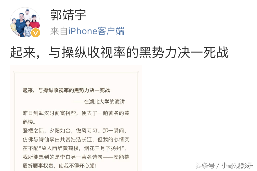 知名导演、编剧郭靖宇一直以来就敢说敢做,早在2014年就因为电视剧《勇敢的心》和湖南经视发生一些口角。而就在近,郭靖宇在湖北大学演讲揭露操作收视率乱像,话语一出就得到了很多圈内人的积极响应,尤其是他旗下艺人刘智扬、何雨虹、于毅等人的点赞支持,包括赵文卓等其他艺人也是大力支持。