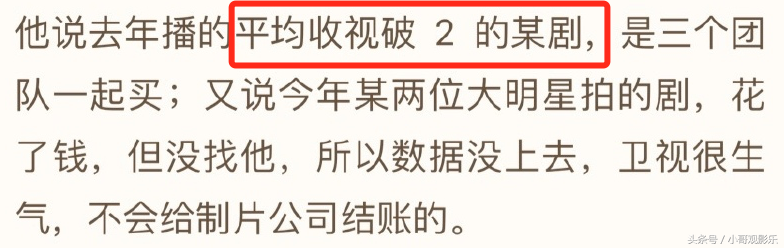 郭靖宇详细描述一些事情的经过,尤其提到了三点内容让网友感兴趣,一是本来计划让《娘道》上映的电视剧换成其他播放的电视剧,而且这名操作收视率的大神担任的总制片人,于是大家纷纷猜测这位大神是谁?这部电视剧又是什么?二是提到去年由两位知名演员出演的的,平均收视率破2的电视剧也是花钱收买的?这部电视剧又是哪部呢?