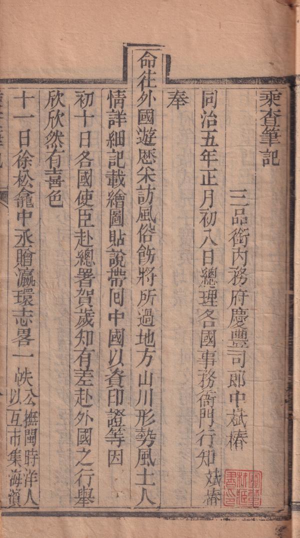 至于在民间层面,王韬如下记述,当足以说明其风行一时的情况:“同治五年,朝廷特遣三品大员斌椿出使泰西诸国,随员数人。在英京时,日出眺览,搜罗奇异,恢扩眼界,真有见所未见、闻所未闻者,如园囿中之珍禽怪兽,不可名状;水涌地中,有若喷珠溅雪;机坊中飞梭运轴,不藉人工,皆水火二力之妙。凡其制作,无不巧夺天工,至于山川风土,亦皆触景异观。登临采访之余,殊深兴感,故各人于耳目所及,寄诸吟咏。遄归之日,著有《乘查笔记》一书,已刊板于京师,一时通国传观,抄襄阳播掿之词者,顿为纸贵。”——此书对于开拓国民视野的作用,是显而易见的。