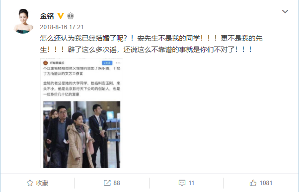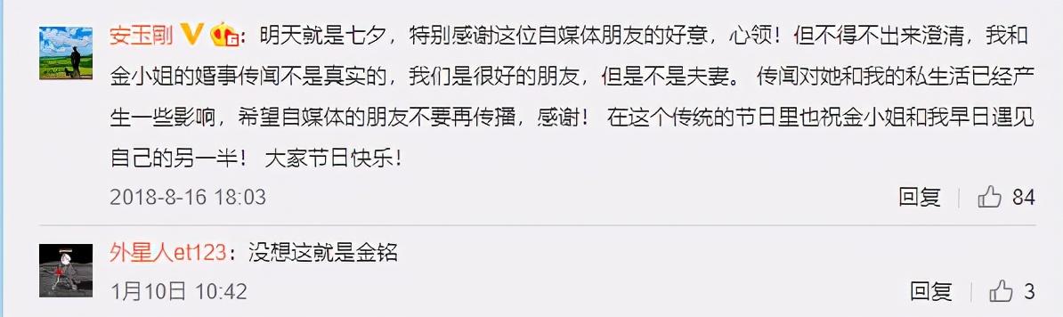 金铭发微博辟谣自己与安玉刚的关系,安玉刚也在金铭微博下面否认了两人的关系:“我和金铭小姐的婚事传闻不是真实的,我们是很好的朋友,但是不是夫妻,传闻对她和我的私生活已经产生一些影响,希望自媒体的朋友不要再传播,感谢!”