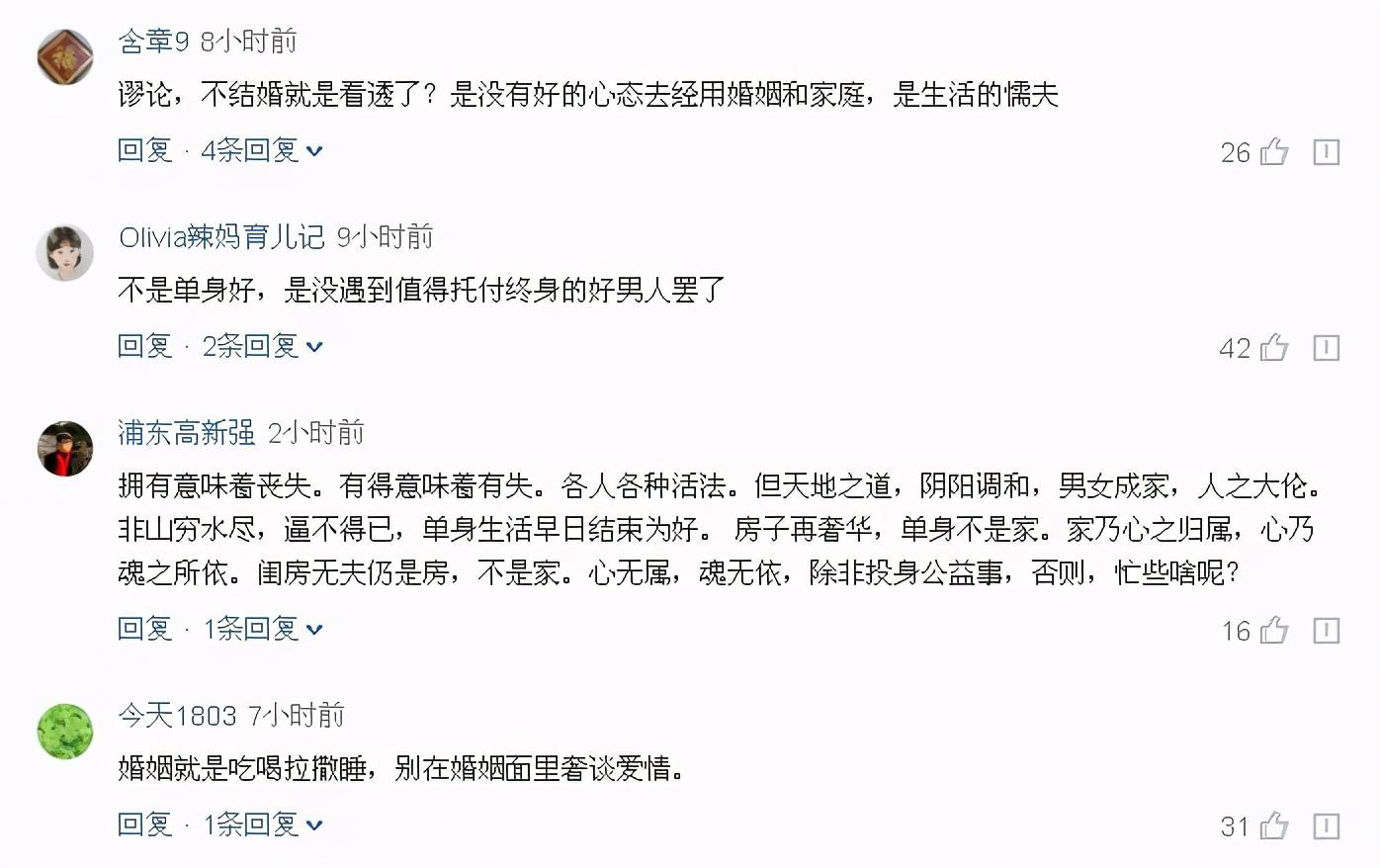 也有人对她的观点表示反对:“谬论,不结婚就是看透了?是没有好的心态去经营婚姻和家庭,是生活的懦夫。”