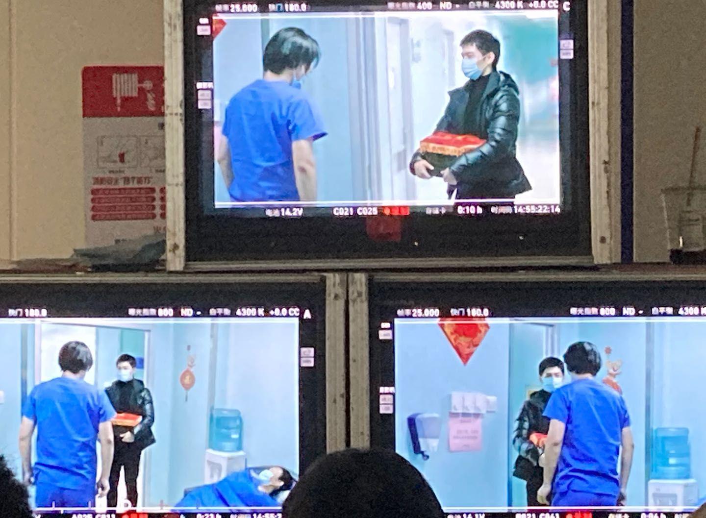 《同行》的现场监视器。这场戏是杨洋把师兄父亲的骨灰盒送还。新京报记者 杨莲洁/摄