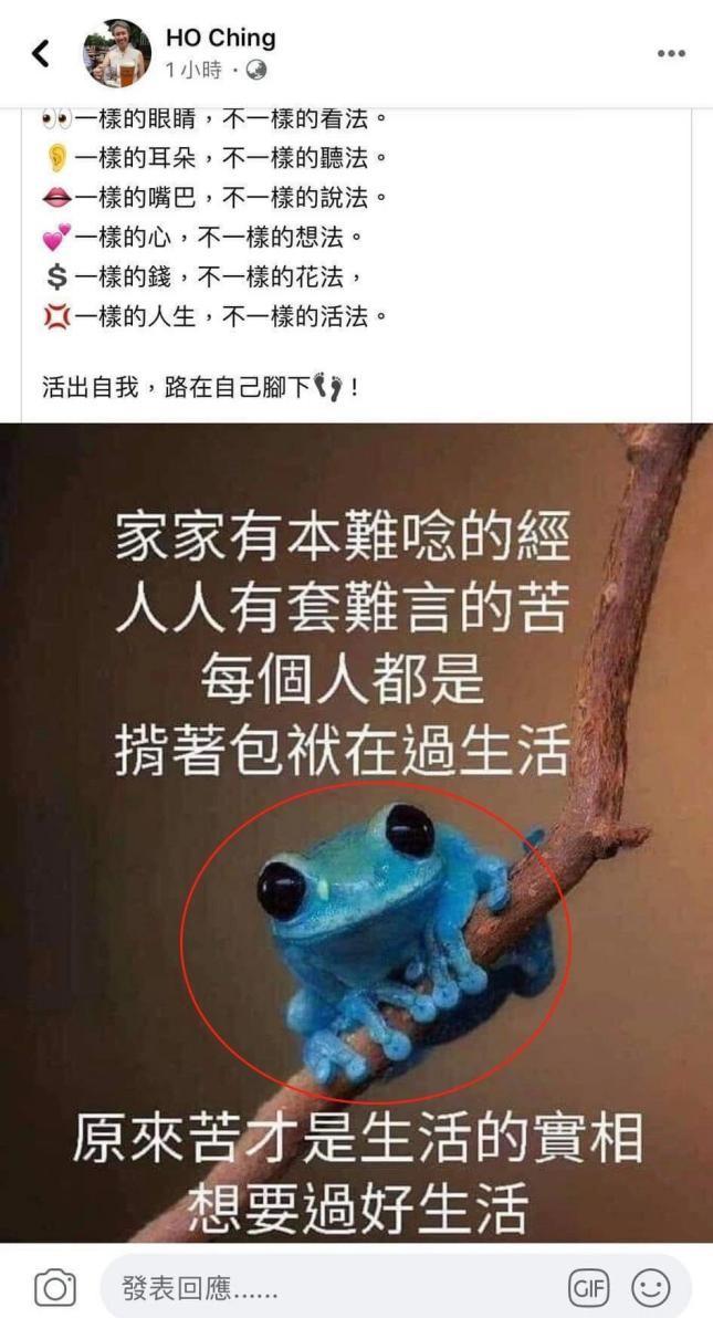 当因为嘲讽台湾省向新加坡捐口罩,何晶被台湾网军围攻时,她并没有认怂,而是转发了一只青蛙的图片。