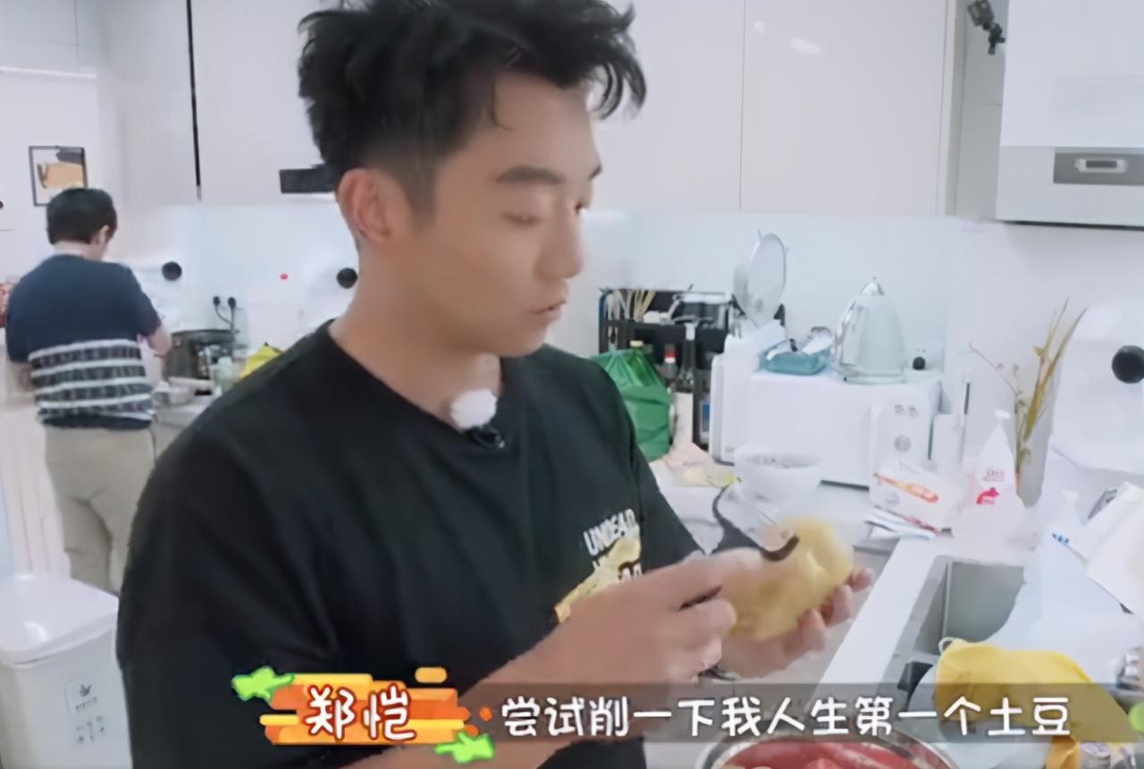 节目中,从来没有下过厨的郑恺对做饭一窍不通,第一次削土豆、切胡萝卜、拍蒜……但这个“厨房小白”做得很认真。