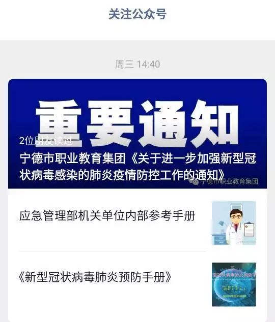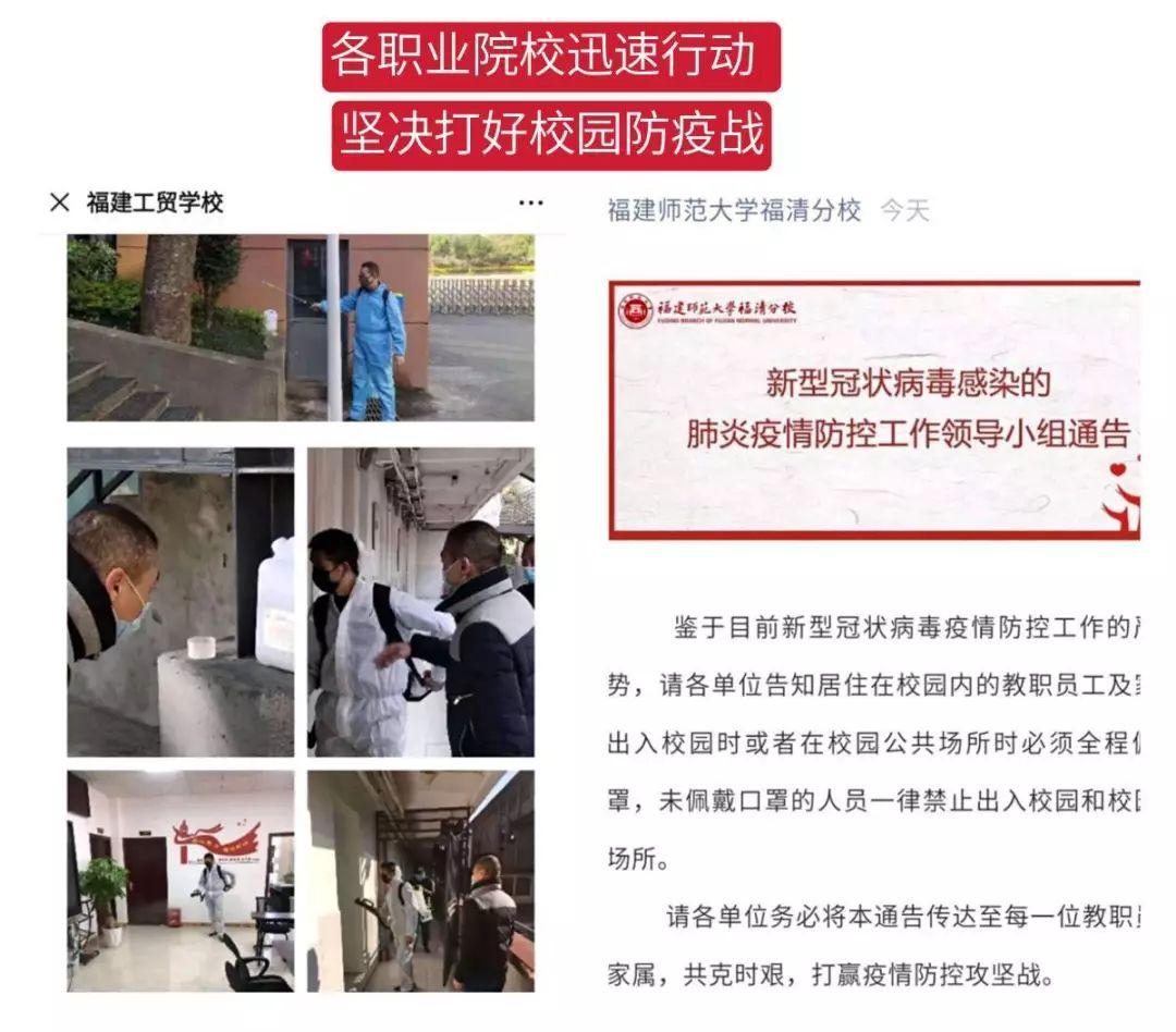 宁德市职业教育集团向集团各学校发出疫情防控工作通知,要求各学校成立疫情防控工作应急小组,做好人员入校管控、顶岗实习、勤工俭学等学生的管理和疫情防控工作,师生做到不信谣、不传谣,不在朋友圈和微信群发布或转发非官方信息。