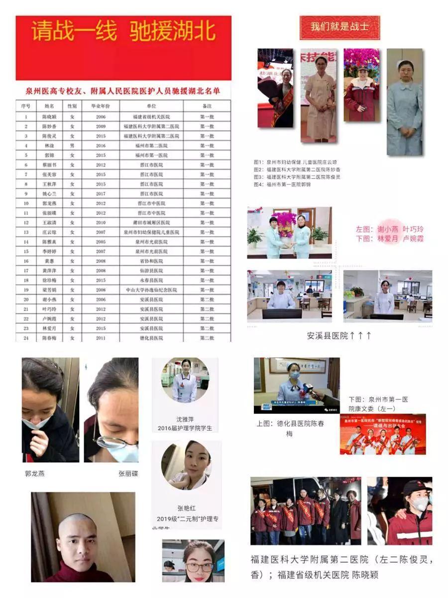 泉州医学高等专科学校召开紧急会议,制定《泉州医学高等专科学校新型冠状病毒感染疫情防控应急预案》,慰问驰援湖北的郭锦、徐珍梅等护理专业毕业生。同时,已有34名泉州医学高等专科学校校友怀着一颗大爱之心,积极响应号召,主动请缨,请战一线、驰援湖北;19名校友作为我省首批援助武汉防控疫情医疗队已经奔赴武汉,奔赴一线参与疫情防控工作。